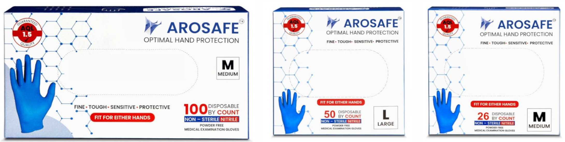 AROSAFE Nitrile examination Gloves Manufactured in India under state of Art manufacturing Process, are used as a good biological and chemical barrier to protect the user’s hands against contamination and infection. Very good alternative solution for individuals who are allergic to Natural Rubber Latex.
